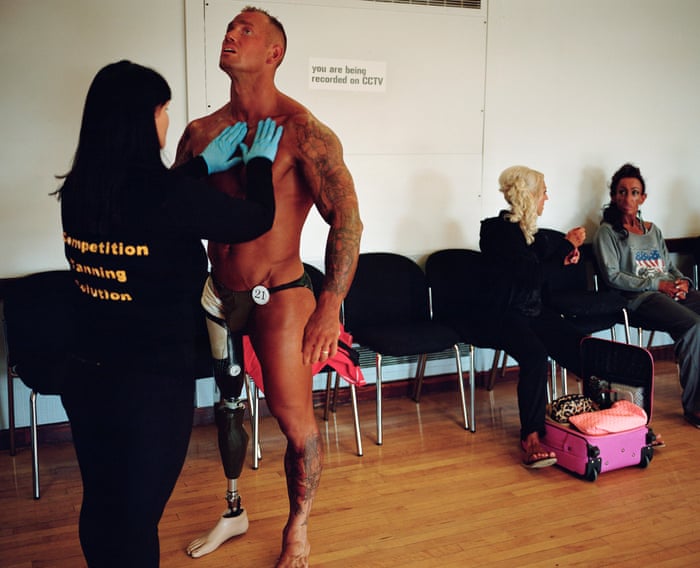 Jedna osoba chystá zažiť, že príjem prvýkrát je Peter Copsey, hora muž s hustým bradou, stmavnutie a prominentný žily, ktorá sa naťahuje sa Smithom a Goodfellow v prázdnom šatni. Bývalý powerlifter, Copsey bolo vypracovanie desiatky rokov - on je 51 a má štyri deti - ale toto je jeho prvá súťaž. Ešte nikdy nikoho v posilňovni o jeho postihnutie, rázštep chrbtice povedané, kým si prečítať o Smitha a Goodfellow na sociálne médiá.Potom sa niečo v ňom zmenilo. "Urobil som všetky tie roky skrývania, aby som si uvedomil, že nemám čo skrývať," hovorí. "A to preto, že som videl Josh a Mark." Facebook Twitter Pinterest Josh Goodfellow (v� �avo) a Smith sa pripravujú na súťaž. Fotografia: Abbie Trayler-Smith pre Guardiana Začal tréning, požiadal svoju ženu, aby aplikovala požadované vrstvy falošného opálenia a vstúpila do súťaže. "Teraz je dobrý čas, aby som povedal:" Pozri, to som ja. Tu sme, "hovorí Copsey po dokončení série push-upov. "A je pekné, že tam sú takí ľudia, s ktorými sa môžem slobodne rozprávať o mojom postihnutí. To nie je to isté pre schopných kulturistov.Nechápte ma zle - idú cez rovnaké množstvo bolesti a prep. - ale s nami…tam je pridané bity "